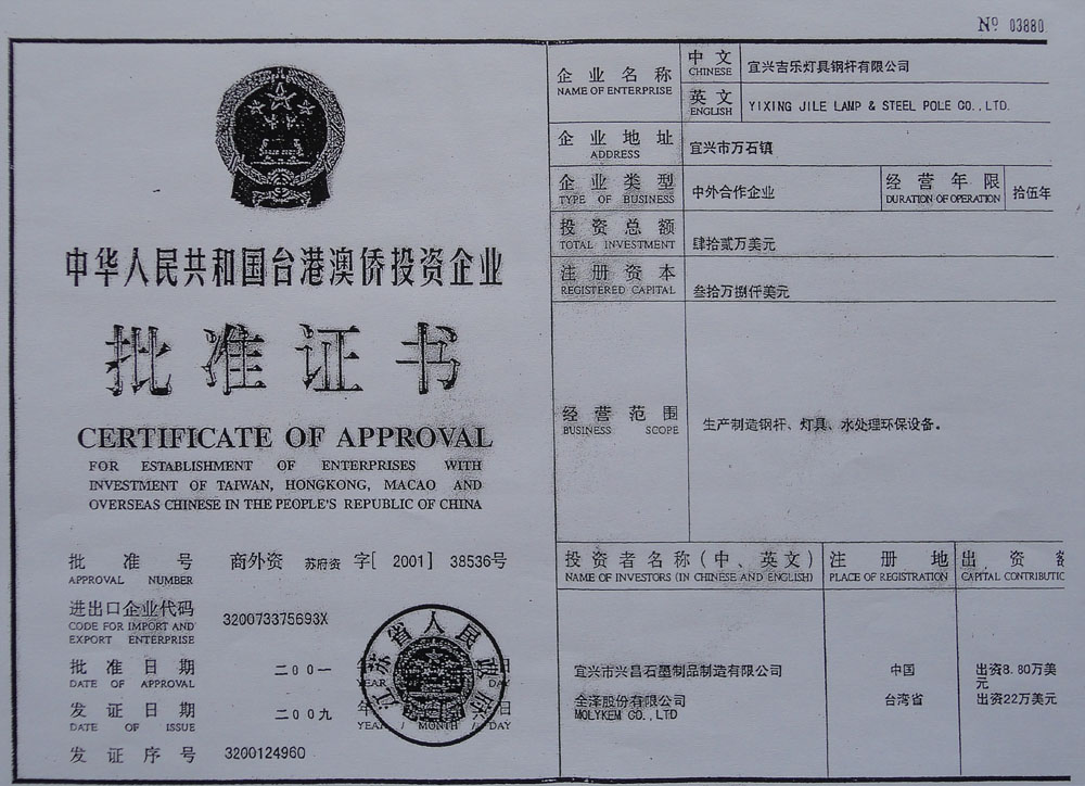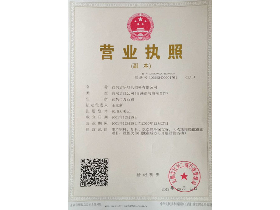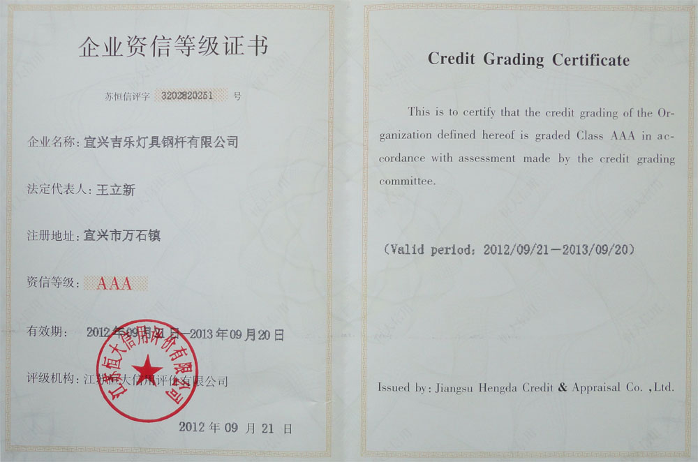 荣誉证书-宜兴吉乐灯具钢杆有限公司